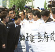圖文:臺灣華航空難公祭 罹難者家屬抗議當(dāng)局無能 2002年06月22日 15:58 ![]() 罹難者家屬向阿扁表示抗議 聯(lián)合報/圖 中新網(wǎng)香港6月22日消息:臺北訊,臺灣當(dāng)局今天上午在臺北市為“五·二五”華航空難罹難者舉行聯(lián)合公祭。眾多罹難者家屬手舉“冤沉大海、還我命來”標(biāo)語,抗議當(dāng)局無能,并要求尋回每一具罹難者遺體。 據(jù)臺灣媒體報道,包括陳水扁、呂秀蓮等眾多島內(nèi)政壇人物在內(nèi),這場聯(lián)合公祭約有三千人參加,靈堂內(nèi)布有鮮花及225名罹難者的遺像,以及鐫刻罹難者姓名的石碑。 在靈堂正中央,設(shè)有一座名為“水火熱淚”的意像品。從失事現(xiàn)場取來的海水被注入“水火熱淚”中后,其中的火炬再被點燃,象征罹難者的精神與魂魄永遠與親人同在。 據(jù)報道,當(dāng)陳水扁步入會場時,傷心欲絕的罹難者家屬手舉白布條,一字排開,高喊著“不要敷衍我們、一定要找出真相”,有人邊流淚邊訴說,失蹤20多天的父親至今還不知下落,仍然被壓在海底。陳水扁稱“搜救沒有時間表”。 另外,不少罹難者家屬認為,今天這場公祭只是一場虛情假意的惡心秀場。 罹難者陳杰人的胞兄難過地表示,這個星期三夜里,他夢見了全身濕透的弟弟,在冰冷的海中載浮載沉,痛苦地向他喊著“哥哥,救命、救命”,當(dāng)他驚醒后,就再也無法入眠。 抗議的白布條上寫著“公祭咒我必死、救命救命、等了很久、我要回家、趕快來接我”等字句,陳家無奈地指出,打撈工作進度實在太慢,這對家屬相當(dāng)不公平,目前還有60多位罹難者仍在深海中沉蕩,今日的聯(lián)合公祭“盛會”,是否宣告著政府與華航責(zé)任已了? 陳杰人的胞兄說,主事者的無作為,讓打撈工作空轉(zhuǎn)了20多天,直到受難者靈肉支離破碎的時刻,才找來確實有能力的新加坡打撈公司,今天公祭意義何在?只不過是一場虛情假意的惡心秀場。 華航一架波音747-200客機5月25日在臺灣海峽澎湖上空解體成4大塊,墜入海中,機上乘客及機組人員全部罹難。目前已找到了158具尸體,還有67具死難者的遺體還未找到。