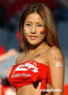 圖:性感女球迷關(guān)注韓德之戰(zhàn) 2002年06月25日 18:47 ![]() 2002韓日世界杯半決賽第一場比賽韓國隊(duì)與德國隊(duì)的比賽將于6月25日晚在漢城進(jìn)行,圖為韓國女球迷性感亮相。