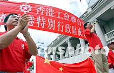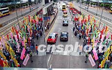 ![]() 香港工會聯(lián)合會,6月30日發(fā)起盛大巡游,慶祝香港特區(qū)成立五周年,圖為近三千名市民組成的巡游隊伍浩浩蕩蕩的途徑中區(qū)鬧市。中新社傳真 洪少葵 攝