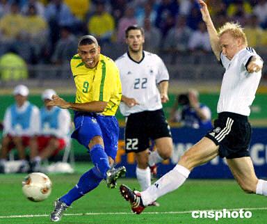 圖:羅納爾多再進(jìn)一球 巴西2:0德國 2002年06月30日 20:40 ![]() 2002世界杯決賽,下半時(shí)羅納爾多再進(jìn)一球,巴西隊(duì)2:0領(lǐng)先德國隊(duì)。圖為羅納爾多在場(chǎng)上拼搶。