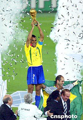 組圖:德國(guó)0:2巴西 卡福高舉大力神金杯 2002年06月30日 21:41 ![]() ![]() 6月30日晚,2002韓日世界杯決賽巴西隊(duì)VS德國(guó)隊(duì)的比賽已經(jīng)結(jié)束,最終巴西隊(duì)以2比0戰(zhàn)勝德國(guó)隊(duì),羅納爾多表現(xiàn)出色獨(dú)進(jìn)兩球。圖為巴西隊(duì)隊(duì)長(zhǎng)卡福高舉大力神金杯。