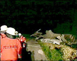 圖文:德國(guó)消防員正在飛機(jī)墜毀現(xiàn)場(chǎng)實(shí)施救援 2002年07月02日 10:51 ![]() 德國(guó)柏林當(dāng)?shù)貢r(shí)間7月2日凌晨(北京時(shí)間7月2日晨7時(shí)),巴登-符騰堡州地方政府的發(fā)言人稱,兩架大型飛機(jī)于7月1日夜(北京時(shí)間7月2日晨)在德國(guó)與瑞士交界的博登湖(又譯康斯坦茨湖)上空相撞,兩架飛機(jī)隨后墜落在湖邊的公路上,目前至少有97人死亡。圖為消防員在飛機(jī)墜毀現(xiàn)場(chǎng)救援。(春風(fēng))