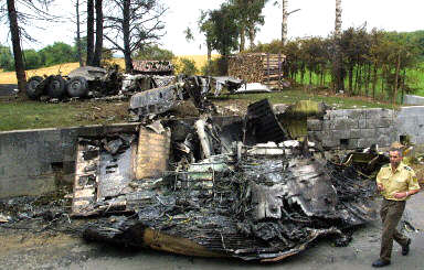 圖文:一警官從墜毀的圖-154殘骸前經(jīng)過 2002年07月03日 14:30 德國當(dāng)?shù)貢r間7月1日夜(北京時間2日晨),一架DHL公司的波音757貨機(jī)和俄羅斯巴什基爾航空公司的圖-154客機(jī)在德國巴登-符騰堡州于伯林根鎮(zhèn)上空相撞并墜毀,造成71人死亡,其中包括52名兒童。圖為一名警官從墜毀的圖-154殘骸前經(jīng)過。(春風(fēng))