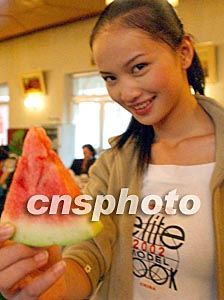 ![]() 正在西藏參加姍拉娜2002世界精英模特大賽中國選拔賽的模特選手,對(duì)拉薩的高原氣候不太適應(yīng),餐桌上的西瓜成為佳麗們的搶手貨。錢興強(qiáng) 攝