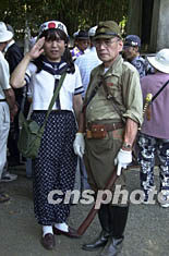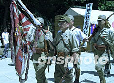 ![]() 十五日是日本戰(zhàn)敗五十七周年紀念日,在供奉有二戰(zhàn)戰(zhàn)犯的的靖國神社前,一群穿著原“鬼子兵”軍服的人趾高氣揚地來回游走。陶光雄 攝