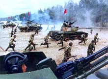 解放軍東海聯(lián)合演練 高科技與實戰(zhàn)融為一體(圖) 2002年08月19日 08:32 ![]() 步坦協(xié)同,席卷敵陣 ![]() 戰(zhàn)鷹突破空中防線 ![]() 獵潛艇劈波斬浪 ![]() 直升機臨空支援 中新網(wǎng)北京8月19日消息:中國官方媒體人民網(wǎng)昨晚發(fā)表解放軍在東海演習的照片,從照片中可以看到演習動用了坦克、軍艦、戰(zhàn)機和直升機。 據(jù)人民網(wǎng)報道,東海某海域進行三軍聯(lián)合作戰(zhàn)演習的南京軍區(qū)隊及配屬的海空軍隊,把現(xiàn)代高科技與未來實戰(zhàn)需要融為一體,為全面掌握現(xiàn)代戰(zhàn)爭的特點和主動權﹑制勝權。 報道指,三軍將士以飽滿的熱情真打真練,能謀善戰(zhàn),斗志高昂,樹立了敢打必勝的信心。