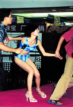 圖文:女模特脫衣推銷 男朋友憤而攪場 2002年08月19日 10:30 ![]() ■長衫就是“防腐層”■短裙代表“塑料”■脫得只剩內(nèi)衣 ![]() ■男友硬拉模特離場 攝影/趙訓(xùn)成 中新網(wǎng)北京8月19日消息:讀者趙先生昨天給北京青年報打來熱線說,他前天在一個購物廣場看到一個管道廠家為了讓人們更了解“管道”的內(nèi)部結(jié)構(gòu),竟然讓兩位假扮“管道”的小姐一層一層脫道具服,直到小姐的男友出面干涉才罷休。 趙先生講述了事件的整個過程:“當(dāng)時,我在商場購物,看見一家管道企業(yè)正在推介產(chǎn)品。兩位扮演‘管道’的女模特當(dāng)著眾人的面脫起衣服,這讓不少觀眾大吃一驚,還有一些母親趕緊捂上孩子的眼睛。這兩位女模特直到露出了穿在里面的內(nèi)衣才停止。忽然,一位女模特的男友出現(xiàn),硬拉女模特要離開,但廠家人員就是不讓,雙方開始爭執(zhí),場面頓時變得異;靵y! 有關(guān)廣告專家分析說,讓消費者反感的廣告形式有可能抬高了企業(yè)的“知名度”,但是卻降低了產(chǎn)品的“美譽度”,反而會給產(chǎn)品銷售帶來負(fù)面效果。畢竟,消費者是否選擇這種產(chǎn)品,最終還是決定于產(chǎn)品質(zhì)量和售后服務(wù),這樣的“秀”還是少做為好。(王旭)