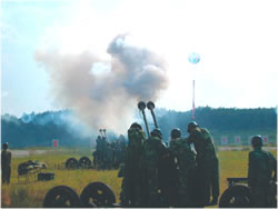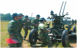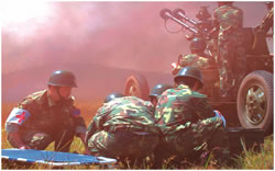 演習剛剛開始,一隊民兵在我高炮陣地附近忙碌著,他們很快設立了一個高炮陣地,原來他們是用報廢的高炮設置了一個假高炮陣地以迷惑來襲之“敵”。與此同時,另一隊民兵在旁邊給一枚導彈模型充氣,不到一分鐘,這枚同樣是用于迷惑“敵人”的地空導彈便豎立起來。