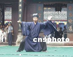 少林、武當(dāng)、峨眉三大武術(shù)門派精英賽二日下午在峨眉山下報國寺舉行,圖為武當(dāng)派掌門人游玄德宗師向觀眾展示的武當(dāng)太乙逍遙拳。作者:魯彥