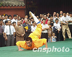 少林、武當(dāng)、峨眉三大武術(shù)門派精英賽二日下午在峨眉山下報國寺舉行,武術(shù)精英聚會峨眉山一展各門派絕技,為中外游人獻上一頓豐盛的“武”餐。圖為少林弟子李少輝向觀眾展示的蝎子拳。作者:魯彥