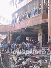 記者今天在現(xiàn)場(chǎng)了解到,發(fā)生爆炸的地方不僅僅只是農(nóng)貿(mào)市場(chǎng),還有與市場(chǎng)相鄰的長(zhǎng)江橡膠廠等地區(qū),甚至一家與農(nóng)貿(mào)市場(chǎng)相隔一條大馬路的餐館亦未能幸免,這家餐館目前已面目全非,窗戶及墻上的玻璃已全部震碎。