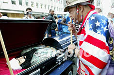 一名美國人制作了一具裝有本·拉登“尸體”的棺木,十一日在紐約世貿(mào)中心前的百老匯大街上示眾,以此紀(jì)念“9.11”事件一周年。作者:王瑤
