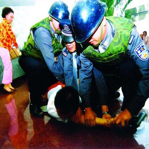 記者在現(xiàn)場看到,正對著歹徒的銀行工作人員邊四處搜集資金邊拖延時間,而旁邊的銀行工作人員趁歹徒不備,偷偷按了桌下緊急按鈕,不到兩分鐘就趕到的公安人員破門而入。據東城公安分局內保處處長蘇保柱介紹,組織“銀行反搶劫”演練,主要是為了增強銀行反搶能力和銀行職工自我保護及制服歹徒的應變能力。(王旭朱麗君)