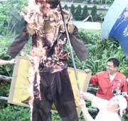 臺灣愛國同心會等團(tuán)體成員上午在“立法院”門外,以鞭打畫著李登輝臉譜人偶等方式,表達(dá)對李登輝的不滿。他們要求李登輝必須為自己的“賣國”言行道歉,否則他們將效法當(dāng)初向李登輝潑紅墨水的史力行,“李登輝走到哪里,就跟到哪里”。