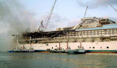 火災(zāi)發(fā)生在昨日下午六時左右。正在進(jìn)行內(nèi)裝修的“鉆石公主”號五層甲板首先起火,由于船內(nèi)尚未配置消防設(shè)備,未受控制的火勢迅速向上蔓延,濃煙翻滾。正在船內(nèi)施工的近千名工人聽到警報后迅速撤出,無人受傷。