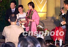 第十六屆澳門國際音樂節(jié)九日晚在澳門玫瑰堂前地舉行“蔡琴、費玉清玫瑰之約”藝術(shù)家之約活動,許多蔡琴的歌迷紛紛走上臨時舞臺向她獻上玫瑰花并輿她合影。李剛 攝