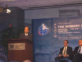 這是今天在此間開幕的大型展覽“歷史的記憶”的重要活動之一。在中美聯(lián)合公報發(fā)表三十周年,江澤民主席即將訪美之際,中國國務(wù)院新聞辦在此間的威爾遜中心舉辦“歷史的記憶”展覽,該展覽分為“駝峰航線”、“陳納德和美國志愿航空隊”、“營救杜利特爾轟炸機隊”三部分,講述“二戰(zhàn)”期間中美在反法西斯戰(zhàn)爭中的合作歷史。