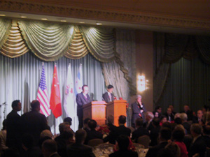 會(huì)見后,江澤民和夫人王冶坪出席了瑞恩州長(zhǎng)、芝加哥市政府和外交關(guān)系委員會(huì)舉行的盛大歡迎晚宴。伊州、芝市各界知名人士四百多人出席了宴會(huì)。