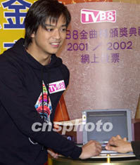 歌星陳曉東10月23日在香港出席《TVB8金曲榜頒獎典禮2001/2002》記者會,為《TVB8金曲榜頒獎典禮2001/2002》在網(wǎng)上為喜愛的歌曲投票。鄧慶樂 攝