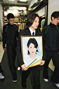據(jù)香港大公報報道,世榮昨日一身黑色西裝,一早在靈堂打點一切,靈堂外寫著“葉府治喪”,旁邊則是“葉門許韻珊夫人治喪處”,表明二人是夫婦關(guān)系。Cynthia舅父周比利,還有朱茵、黃貫中到場;而各大唱片公司滾石、環(huán)球、環(huán)球高層陳少寶、黃家強(qiáng)亦有送上花牌悼念。喪禮采用道教儀式,世榮的花圈放在中央,上書“韻珊愛妻靈右Good bye my love I Love You世榮”;而世榮的父母亦以“家姑”﹑“家翁”身份送上花圈。