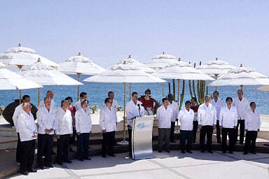 記者看到,上午八時(shí)半左右,墨西哥總統(tǒng)?怂辜丛跁䦂鐾庖灰挥蚺c會者。九時(shí)許,按APEC傳統(tǒng),與會領(lǐng)導(dǎo)人和代表著東道主提供的特色民族服裝拍攝“全家!。與上屆上海峰會的中式唐裝相比,今天的“瓜亞貝拉”同樣極有“個(gè)性”,它是墨西哥東南部流行的一種傳統(tǒng)服裝,為精一色的白色,有四個(gè)胸袋。合照背景為太平洋碧藍(lán)的大海,藍(lán)白相襯,在美麗的洛斯卡沃斯留下了一道亮麗的風(fēng)景線。