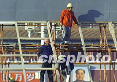 北京工人們十月底在天安門廣場安裝大型字牌,準(zhǔn)備迎接中共十六大的召開。作者:滿會(huì)喬
