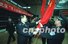 為迎接中共十六大,十一月一日全市八個城區(qū)的七十萬治安保衛(wèi)人員走上街頭,維護治安秩序,預防各類案件及災害事故的發(fā)生。圖為北京宣武警方為此舉行了隆重的授旗儀式。作者:任海霞