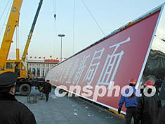 組圖:天安門廣場吊裝巨型標(biāo)語牌的新景觀