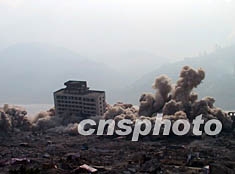 三峽庫區(qū)迄今為止最大規(guī)模爆破,四日上午十時(shí)五十分在重慶奉節(jié)實(shí)施。這座具有詩城美譽(yù)的千年歷史文化名城傾刻間灰飛煙滅,明年三峽庫區(qū)二期蓄水后這里將成為一片汪洋。前來參加爆破實(shí)施的中國國務(wù)院三峽建設(shè)委員會(huì)副主任、重慶市副市長甘宇平成為了媒體采訪的焦點(diǎn)人物,他表示此次爆破意味著三峽庫區(qū)建筑物爆破工作基本結(jié)束。作者:鄒輝