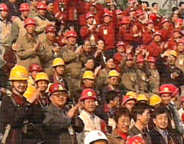 圖:現(xiàn)場(chǎng)工程人員慶賀上游圍堰合龍成功