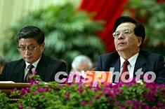 曾慶紅(右)八日在北京中共十六大的主席臺(tái)上出席開幕式。作者:毛建軍