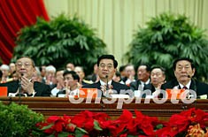 朱镕基、胡錦濤和李嵐清八日在北京中共十六大的主席臺(tái)上出席開幕式。作者:毛建軍