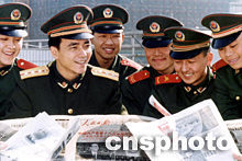 黨的十六大勝利召開引起部隊(duì)官兵的廣泛關(guān)注,連日來,武警南京市支隊(duì)充分利用每天“聽廣播、讀報(bào)、看新聞聯(lián)播”三個(gè)“半小時(shí)”時(shí)間,及時(shí)組織部隊(duì)收聽收看黨的十六大會議報(bào)道,激勵(lì)青年官兵立足軍營建功立業(yè)的豪情壯志,永遠(yuǎn)做黨和人民的忠誠衛(wèi)士。圖為11月9日午休后,八中隊(duì)中隊(duì)長婁曙光(圖中)組織戰(zhàn)士們閱讀當(dāng)天報(bào)紙。中新社傳真 吳俊攝