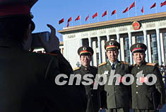 出席中共十六大的三名將軍代表在北京人民大會(huì)堂前合影留念。作者:滿會(huì)喬