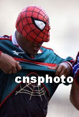 進球后馬科斯裝扮成蜘蛛狹 吳峻 攝