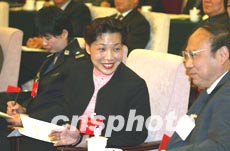 來自北京公交系統(tǒng)的十六大代表李素麗,在北京代表團分組會上與代表一起討論十六大報告。著名勞動模范李素麗曾是巴士車上的一名普通售票員,現(xiàn)在主持“公交李素麗服務(wù)熱線”工作。作者:毛建軍