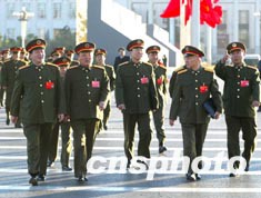 中國(guó)軍方高級(jí)將領(lǐng)的黨代表們,十四日清晨在北京出席中共十六大閉幕會(huì)。