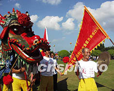 街道路邊椰樹上掛著紅燈籠和慶祝十六大閉幕的紅色標(biāo)語。下午二時,海口最大的綠化公園早已人山人海,鼓號陣陣,?谌嗣駪阎鵁o比激動的心情,在這片草地上載歌載舞,用舞龍、舞獅、秧歌、扇舞、竹竿舞、腰鼓、軍樂、太極拳等方式,表達他們喜悅的心情。