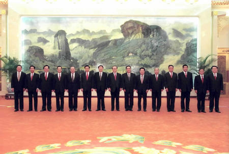 中新社北京十一月十五日電 中國(guó)國(guó)家主席、中央軍委主席江澤民和十五屆中央政治局其他常委李鵬、朱镕基、李瑞環(huán)、尉健行、李嵐清,新當(dāng)選的中共中央總書記胡錦濤和十六屆中央政治局其他常委吳邦國(guó)、溫家寶、賈慶林、曾慶紅、黃菊、吳官正、李長(zhǎng)春、羅干,今天下午在人民大會(huì)堂會(huì)見(jiàn)了出席十六大的全體代表,并同大家合影留念。