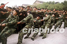 以培養(yǎng)解放軍各級政治干部的南京政治學(xué)院,女兵們在初冬的周末進行拔河比賽,眾多男兵為她們吶喊助威。作者:王興會