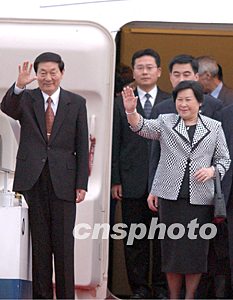 中國國務(wù)院總理朱镕基和夫人勞安,11月18日下午乘坐專機抵達(dá)香港參加“第十六屆世界會計師大會”。中新社傳真 任晨鳴 攝