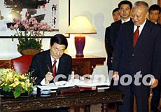 十一月十九日,香港特區(qū)政府在禮賓府設(shè)宴歡迎國(guó)務(wù)院總理朱镕基,朱總理在禮賓府題字留念。中新社傳真潘索菲攝