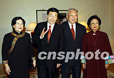 十一月十九日,國(guó)務(wù)院總理朱镕基和夫人勞安在香港禮賓府與香港特首董建華夫婦合影。中新社傳真潘索菲攝