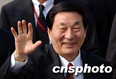 在停機(jī)坪,朱镕基和夫人勞安與前來(lái)送行的香港特首董建華和夫人董趙洪娉等人握手道別。