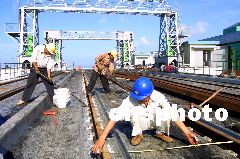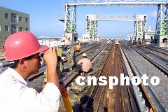 12月2日,隨著最后一根長(zhǎng)25米的特制鐵軌,成功鋪設(shè)在粵海鐵路南港棧橋橋面,全長(zhǎng)8738米的粵海鐵路南港棧橋鐵軌與?诨疖(chē)站鐵軌接軌。至此,中國(guó)第一條跨海鐵路粵海鐵路南北港碼頭鐵路線全線貫通。圖為施工人員在南港棧橋上進(jìn)行測(cè)量和鋪軌工作。古月 攝