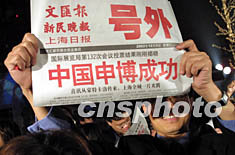 三日晚,當中國上海申博成功的喜訊從蒙特卡洛傳來的時候,上海全城沉浸在一片歡樂之中。圖為申城市民在慶祝中國申博成功。作者:湯彥俊