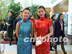 十二月三日,靚麗的中國申博形象大使袁鳴(左)和丁曉軍身著民族服裝出現(xiàn)在摩納哥國際展覽局會議場館內(nèi),引來很多關(guān)注的目光。作者:崔煜芳