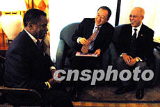 全美中文學校協會第四次全國代表大會七日在芝加哥開幕,中國國務院僑辦副主任劉澤彭(中)率團出席會議,會前與美國勞工部副部長、財務總長莫天成(左),美國教育部副部長、財務總長杰克馬丁親切交談。作者:王瑤