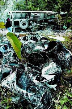 前天1時(shí)50分,一輛車牌號(hào)為桂GA1416的解放牌平頭大貨車在金秀瑤族自治縣七建鄉(xiāng)至三角鄉(xiāng)途中翻下約60米高的山坡,滑下金秀河道。車上載著的100桶共20噸三氧化二砷(俗稱砒霜),有33桶跌入河道,其中30桶不同程度破損,少量砒霜散落河水中,其余67桶翻在山坡上。目前,此事已經(jīng)上報(bào)中央和國(guó)務(wù)院,中央政治局常委、國(guó)務(wù)院副總理吳邦國(guó)要求迅速妥善處理好此事。