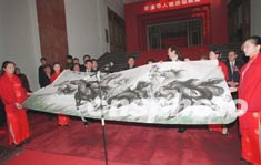 旅澳華人畫家姚迪雄先生(右),十八日在北京中國(guó)革命博物館開幕的個(gè)人畫展上,向北京奧林匹克博物館敬贈(zèng)《八駿圖》大幅國(guó)畫。作者:鄒憲